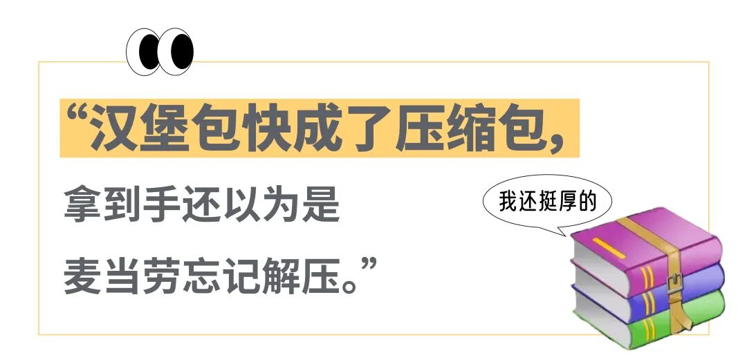 平等缩小汉堡的麦当劳也没有忘了午晚餐单品,心碎麦香鱼和清风手帕纸一样大,巨无霸变成巨小霸,“汉堡包快成了压缩包,拿到手还以为是麦当劳忘记解压。”