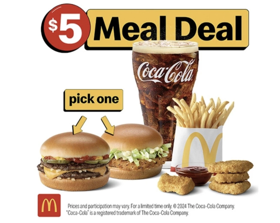 McDonald $5 Meal Deal,一份5美元,包含汉堡、薯条、鸡块和可乐,比单独购买每份主食便宜15%,每年在特殊时间限时上架。
