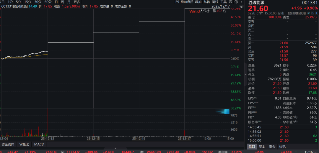12月17日,液化天然气(LNG)物流龙头企业胜通能源(001331.SZ)开盘后涨停封板,连收4个涨停板。连续涨停期间,该股累计涨超46%,股价自16.23元/股攀升至21.6元/股。