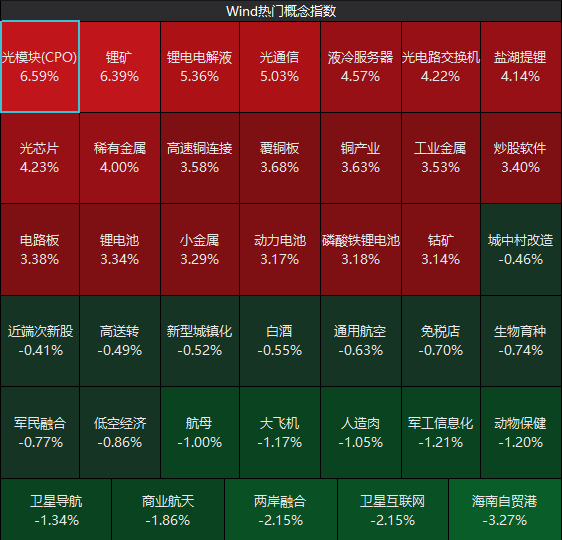 今天早盘,算力产业链一度逆势上涨,午后则随着大盘“强上强”。Wind数据显示,CPO板块大涨6.59%,居全市场第一。光通信、液冷服务器等概念紧随其后。