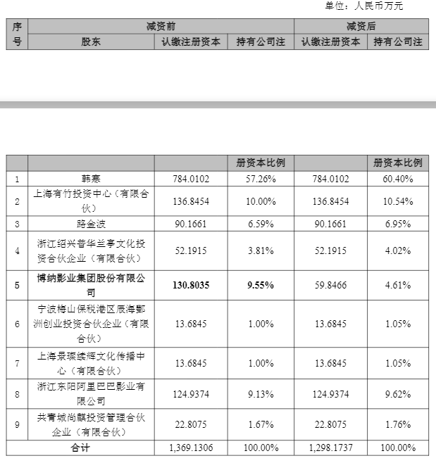 公告显示,上海亭东的最大股东为韩寒,在博纳影业减资前的持股比例为57.26%,减资后会上升至60.4%。