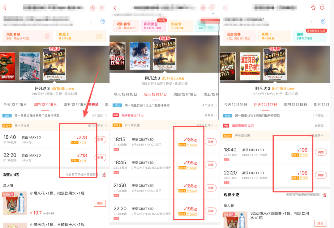 据媒体报道,点映期间有影院票价高达228元一张,其余百元以上的高票价场次主要集中在IMAX 3D、CINITY LED等特效厅。相比之下,普通影厅的票价基本在百元以下。