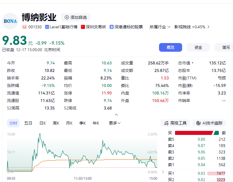 今日开盘,博纳影业盘中再度跌停,最终报收于9.83元/股,跌9.15%,总市值为135.12亿元,换手率为22.24%。