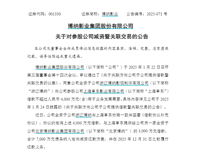 根据浙江博纳与上海亭东协商一致并签署《借款协议补充协议》(以下简称《协议》),《协议》约定将上述4000万元借款,与上海亭东提供给公司另一家全资子公司北京博纳影业集团有限公司(以下简称“北京博纳”)的3000万元借款,合计7000万元债务纳入定向减资还款方案,并在2025年12月31日之前履行还款义务。