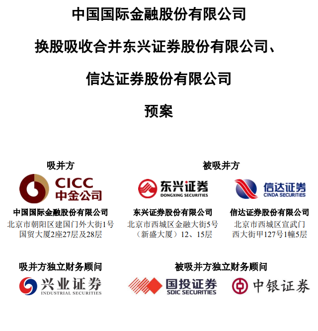 红星资本局12月17日消息,今日晚间,中金公司(601995.SH;03908.HK)通过换股方式吸收合并东兴证券(601198.SH)、信达证券(601059.SH)重大资产重组预案披露,三家公司股票于12月18日开市起复牌。合并后,中金公司有望成为第四家万亿资产规模的券商。