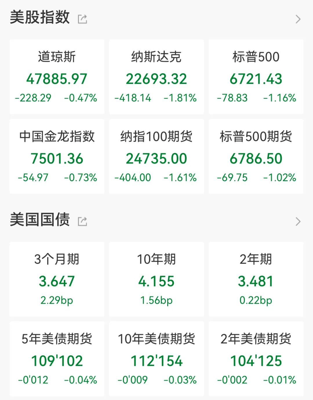 当天,标普500指数下跌1.16%,收于6721.43点;纳斯达克综合指数重挫1.81%,报22693.32点;道琼斯工业指数下跌228.29点,跌幅0.47%,收于47885.97点。标普500和道指均录得连续第四个交易日下跌,市场情绪明显趋于谨慎。