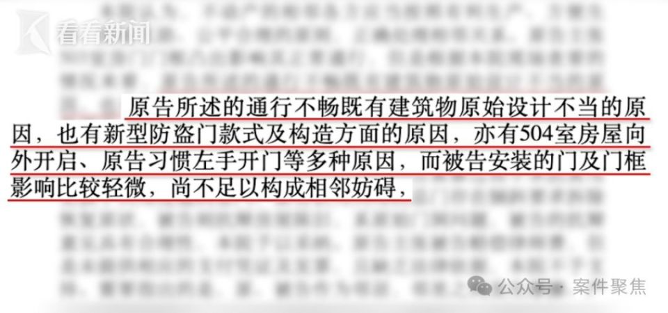 这场邻里纠纷很快闹上法庭。杨浦区法院一审认为,肖阿姨通行不畅是多种因素导致的——既有防盗门款式问题,也有她自家门外开、习惯左手开门的原因,陆女士安装的门影响轻微,因此驳回了肖阿姨的诉求。