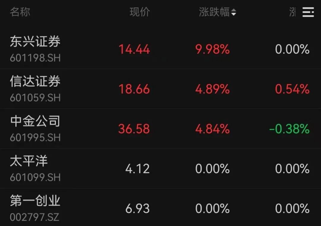 中金公司、信达证券涨幅均收窄至5%以内;此前, 中金公司以涨停价开盘,信达证券高开近7%。