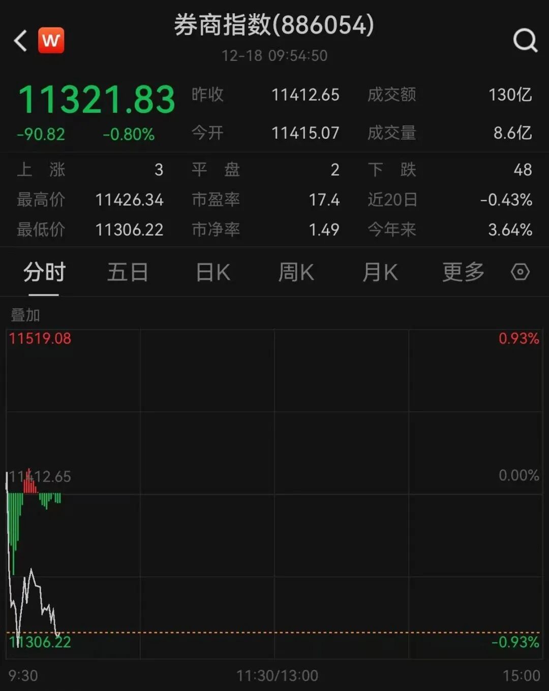 12月18日,证券板块高开低走,截至发稿,相关指数跌幅达0.8%。