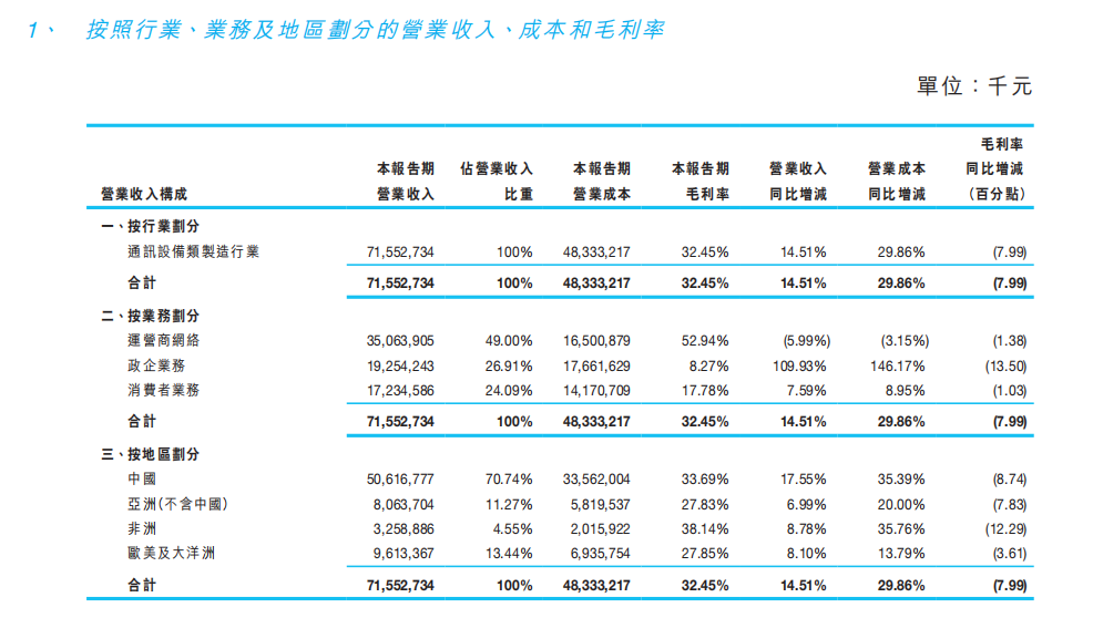 值得注意的是,公司上半年运营商网络业务营收约350亿元,占总营收的49%,是近10年来首次跌至50%以下。政企业务由原来的14.68%上升至26.91%。