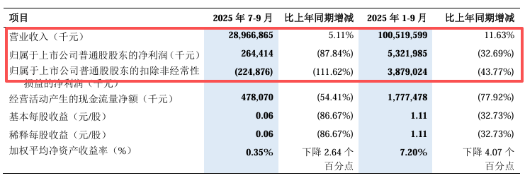 单看第三季度,公司营收为289.67亿元,同比增长5.11%;归母净利润为2.64亿元,同比暴跌87.84%;扣非净利润为-2.25亿元,相较于去年的19.35亿元暴跌111.62%。公司陷入增收不增利的局面,盈利能力大幅下降。
