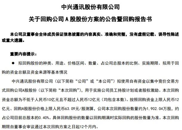 12月12日,中兴通讯发布关于回购公司A股股份方案的公告,公司拟使用自有资金以集中竞价交易方式回购股份,将用于实施公司员工持股计划或者股权激励。本次回购资金总额不低于10亿元且不超过12亿元(均包含本数)。