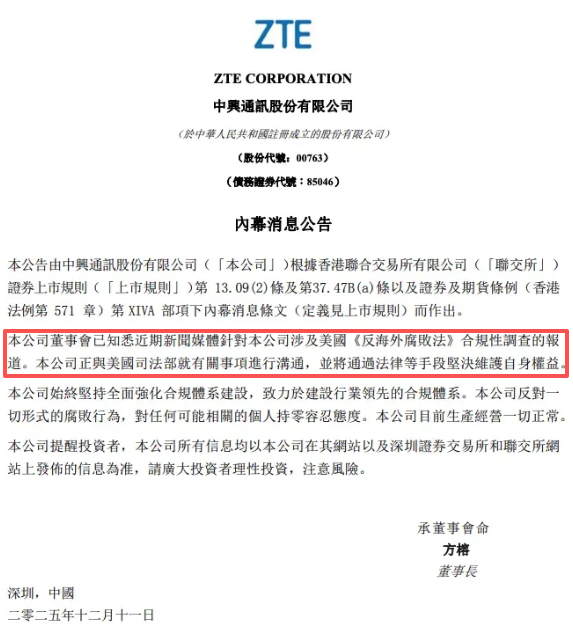 11月11日午间,中兴通讯紧急发布公告,称公司董事会已知悉近期新闻媒体针对本公司涉及美国《反海外腐败法》合规性调查的报道,正与美国司法部就有关事项进行沟通,并将通过法律等手段坚决维护自身权益。