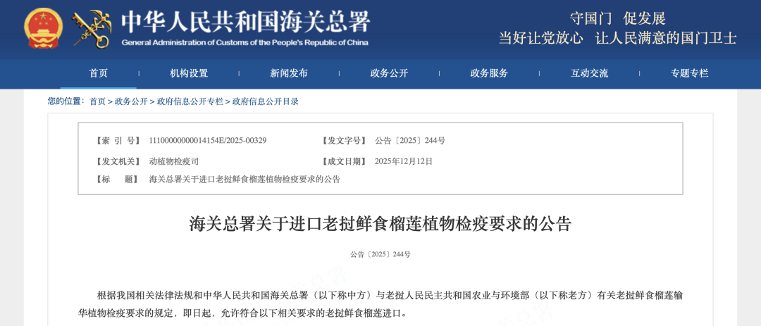 12月12日,中国海关总署发布《关于进口老挝鲜食榴莲植物检疫要求的公告》,即只要符合检疫要求,老挝榴莲就可输入中国;相关人士预测,2026年老挝可向中国出口400吨榴莲,价格或将低于泰国和马来西亚。