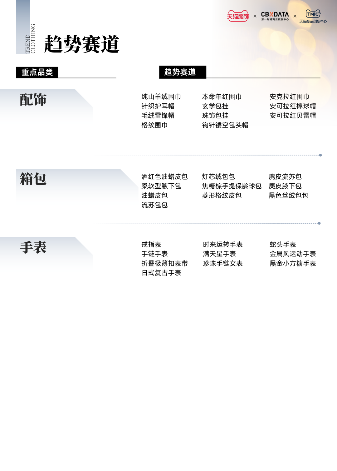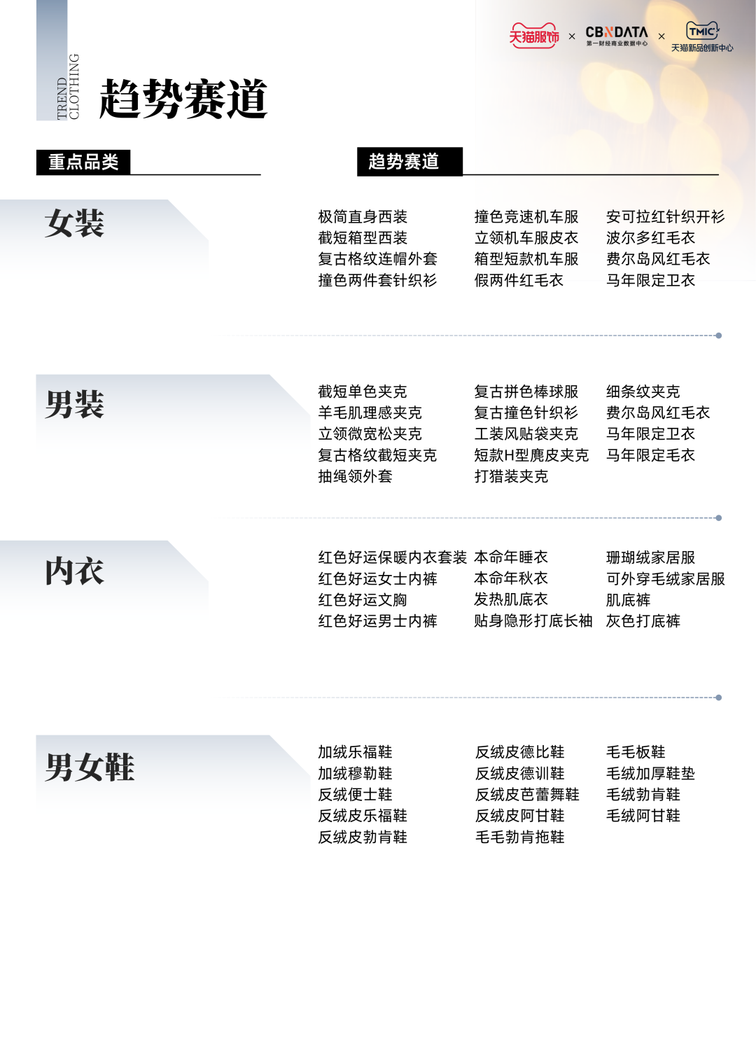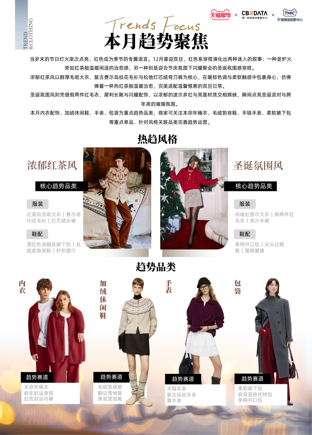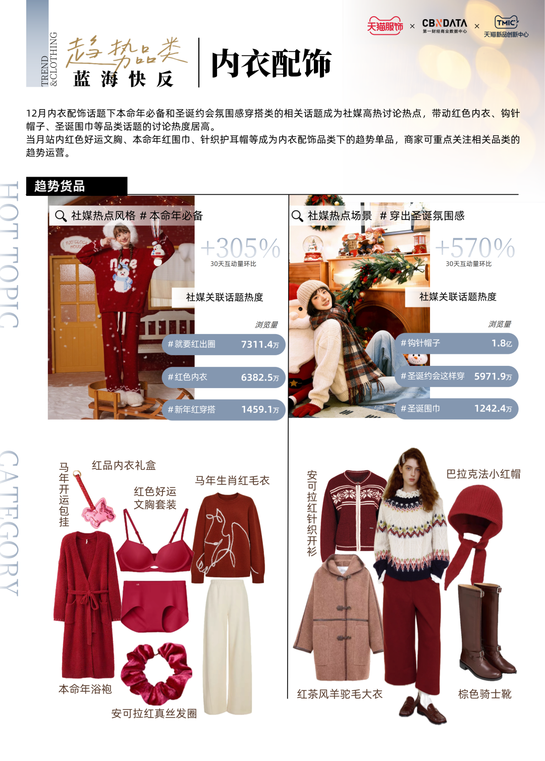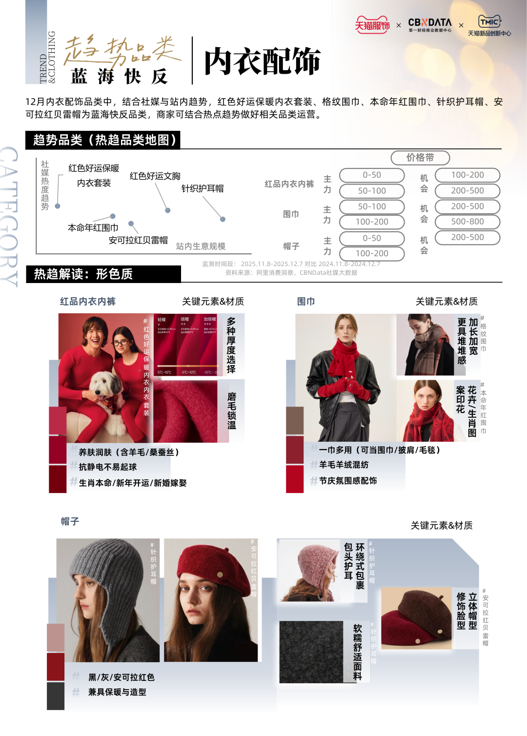 寓意美好的本命年红围巾、温暖百搭的加绒乐福鞋、精致浪漫的珍珠手链手表、时髦实用的酒红色油蜡皮包……这些趋势单品共同组成了12月的服饰趋势热点。除了对于上述四大重点趋势品类的解析,《报告》还基于社交媒体热度、市场消费规模以及供需状况,聚焦女装、男装、内衣、男女鞋等品类,围绕细分趋势赛道挖掘潜力单品,提供前沿服饰消费洞察。