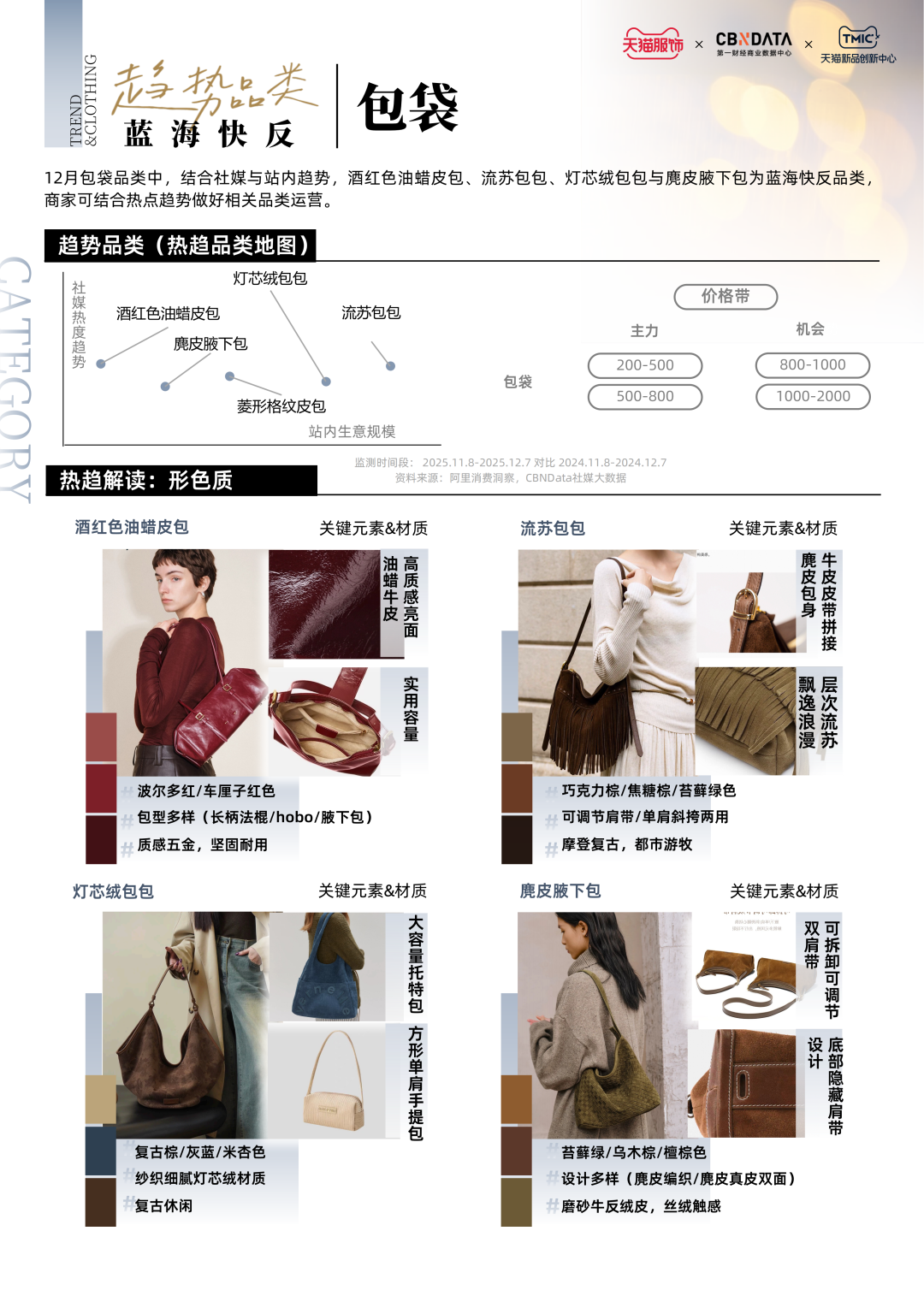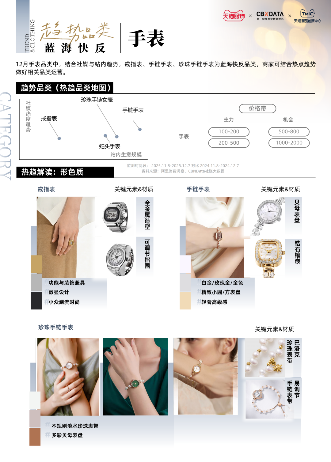 围绕风格演变与市场需求,内衣配饰、加绒休闲鞋、手表、包袋成为12月重点趋势品类。面对年末购物热情与赠礼需求,品牌亟需精准洞察趋势货盘,关注本命年睡衣、毛绒勃肯鞋、手链手表、柔软腋下包等重点单品,并针对风格关联品类完善趋势运营。