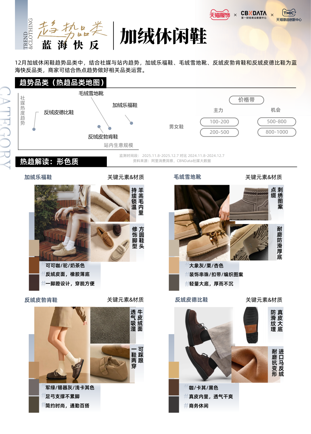 本月,加绒乐福鞋、毛绒雪地靴、反绒皮勃肯鞋和反绒皮德比鞋成为高潜力快反品类。加绒乐福鞋以可可咖、驼色、奶茶色为主调,采用反绒皮面与橡胶薄底,一脚蹬设计穿脱方便、羊羔毛内里持续锁温、方圆鞋头修饰脚型,成为百搭又舒适的“冬日保暖神器”。毛绒雪地靴在大象灰、栗色等沉稳底色上,装饰串珠、扣带或编织图案,打破了传统雪地靴的厚重印象,厚实绒毛配合轻量大底,实现“厚而不沉”的穿着体验。