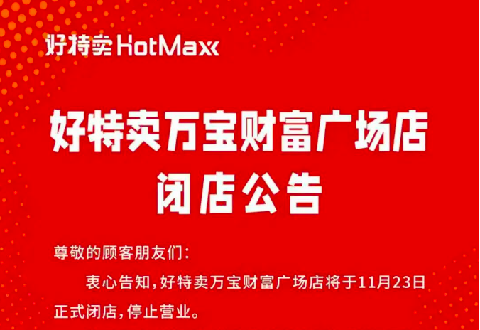 红星资本局注意到,在小红书等社交平台上,有多位用户发文称,其城市核心商圈的好特卖门店已经关闭,包括镇江万达广场、仙桃吾悦广场等。11月16日,好特卖苏州万宝财富商业广场店也发布“闭店公告”,称停止营业。