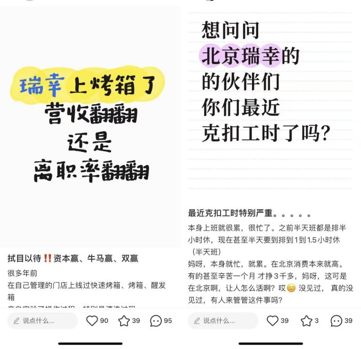 最近,瑞幸咖啡员工们的“火气”有点大。先是瑞幸员工吐槽门店增加烤箱“忙不过来”;后又有自称瑞幸员工的网友爆料,称公司存在“克扣工时”等问题,瑞幸也因此站上了风口浪尖。
