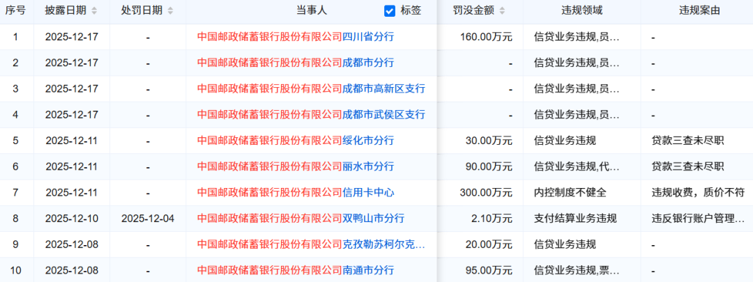 如下图企业预警通统计显示,仅12月至今邮储银行就收到罚单10张。