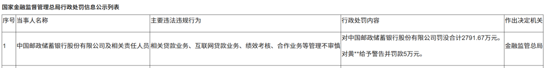 更早之前的9月30日,邮储银行总行曾因贷款业务、互联网贷款、绩效考核等多领域管理不审慎,被国家金融监管总局处以合计约2791.67万元的巨额罚款。