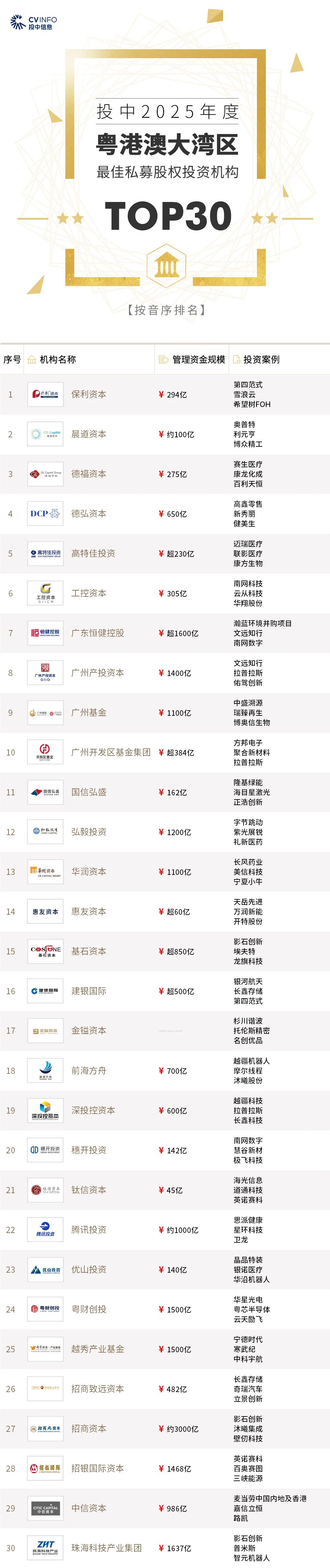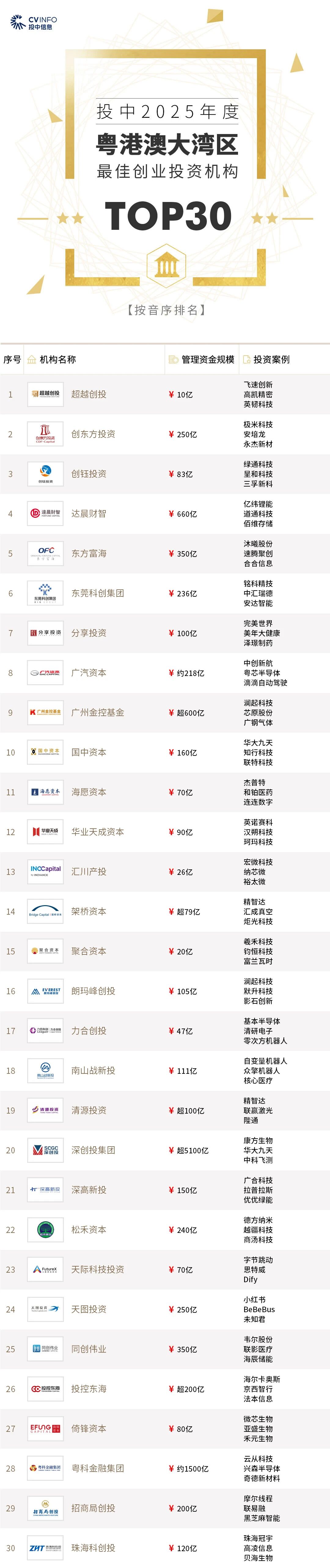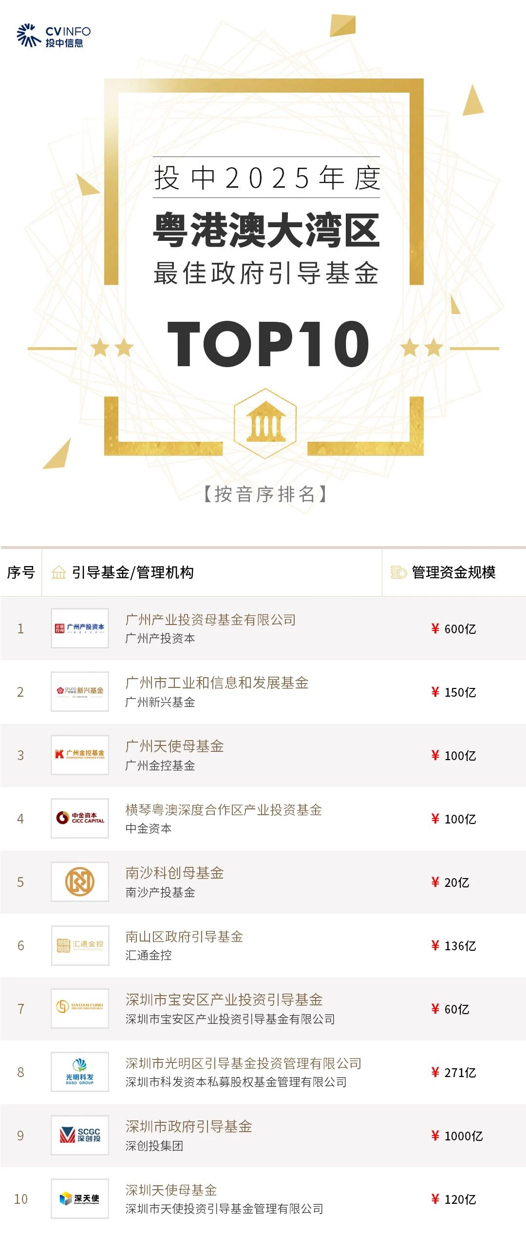 随着粤港澳大湾区建设步伐的加快,区域内的投资生态日益丰富多元,投资机构在大湾区的布局与竞争也愈发激烈,值此之际投中信息于2025年12月19日发布“2025年度粤港澳大湾区榜单”。该榜单对大湾区头部近超200家股权投资机构和约60家引导基金进行了调研,采取了定量与定性相结合的方式,依据在管规模、投资及退出等评选指标对选取机构进行评定,经过初选、信息核实及最终排名等环节,并综合考量机构的市场影响力及声誉度,最终根据分数选定符合条件的投资机构入榜。