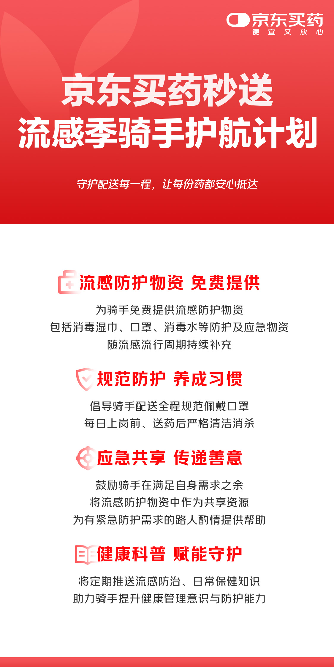 近日,全国流感进入高流行水平,药品即时配送需求激增。穿梭于城市中的骑手成为连接健康与急需的关键纽带。而频繁接触各类环境与人群,也让他们的健康防护面临考验。保障骑手健康,不仅是对劳动者的关怀,更是确保药品安全配送、让用户安心买药的重要基础。为此,京东买药秒送正式推出“流感季骑手护航计划”,以多维度举措为骑手与用户双向护航,用户在流感季买药更放心、更安心。