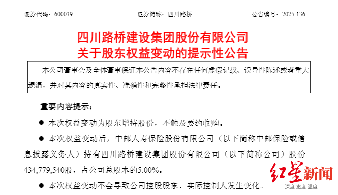 增持后,中邮保险持有四川路桥4.35亿股,占公司总股本的5.00%,完成举牌。此次权益变动为股东增持股份,不触及要约收购,且不会导致公司控股股东、实际控制人发生变化。