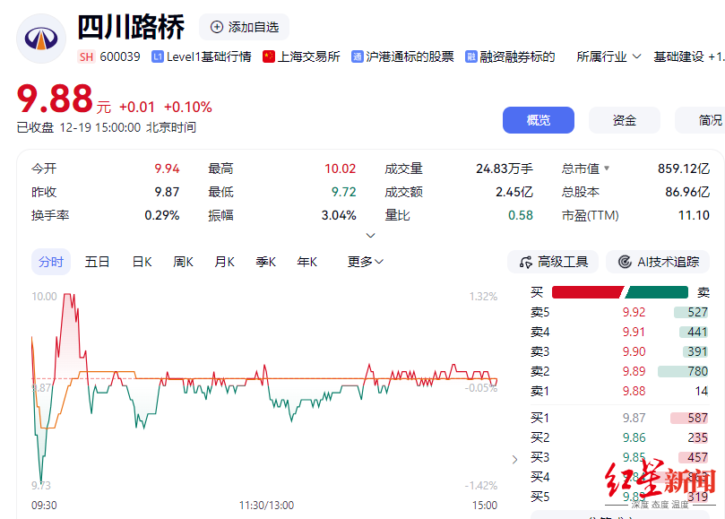截至今日收盘,公司报9.88元/股,涨0.1%,总市值为859.12亿元。