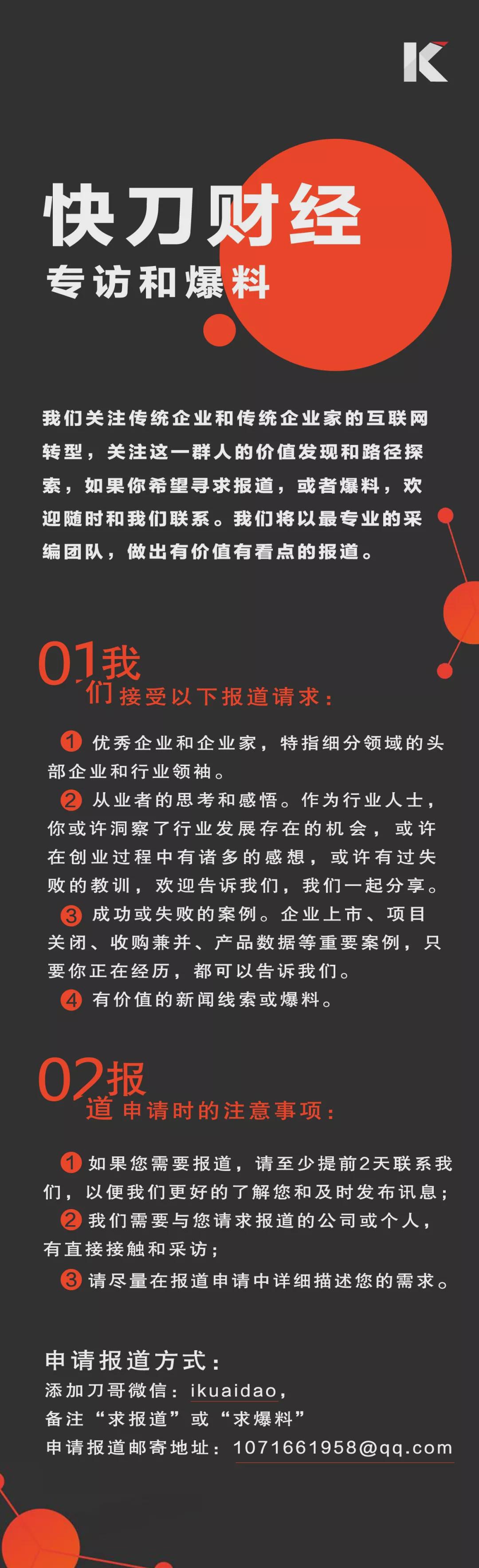 快刀财经已同步入驻:36氪、虎嗅网、钛媒体、i黑马、品途网、商界、趣头条、砍柴网、梅花王、艾瑞专栏、亿欧网、创业邦、知乎、雪球、今日头条、百度百家、界面新闻、一点资讯、网易号、搜狐自媒体、凤凰网、新浪财经头条、新浪看点、UC大鱼号、天天快报、企鹅自媒体、投资界、思达派、猎云网、简书等30多家自媒体平台。