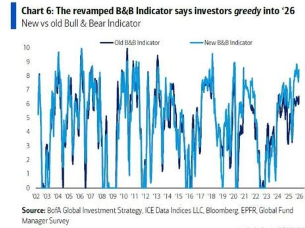 尽管宏观展望积极,但美银的多空情绪指标已从7.9升至8.5,触及风险资产的反向卖出信号阈值。该指标超过8.0通常意味着市场情绪已进入极度乐观区间,历史上往往预示短期调整压力。