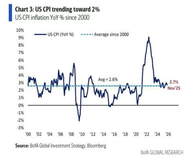 美银策略师Michael Hartnett为2026年上半年构建了宏观交易框架。在乐观情景下,若CPI回落至2%且10年期美债收益率降至3.5%左右,风险资产有望获得显著支撑。