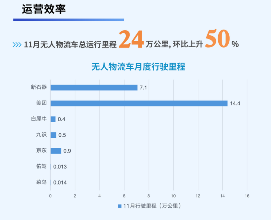 按品牌划分的话,新石器活跃车辆规模最大,达220台;其次为美团138台,领先于白犀牛、九识智能等构成的第二梯队。而从月度行驶里程来看,主要进行即时配送的美团无人车9月运营行驶了12.7万公里,排名第一。
