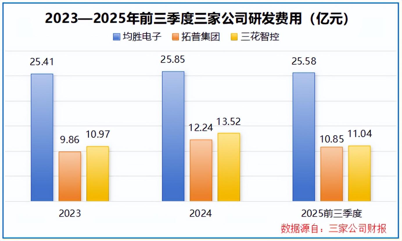 从投入规模来看,2023-2025年前三季度,均胜电子研发费用一直高于三花智控、拓普集团等同行企业。