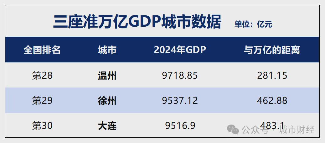 2024年温州GDP为9718.85亿元,距离万亿目标仅差281.15亿元。同期的徐州差462.88亿元,大连差483.1亿元。