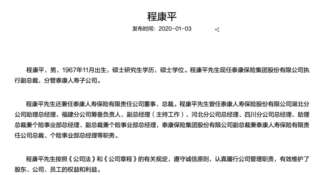 截至目前,泰康人寿母公司泰康保险集团官网上,关于程康平的信息还没有更新,他依然系泰康保险执行副总裁,兼任泰康人寿董事、总裁。