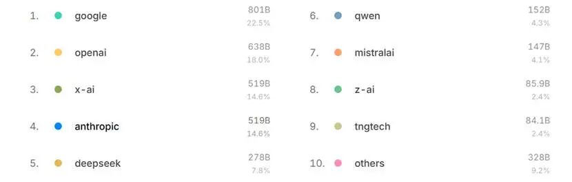 图:不同大模型厂商的市场份额趋势,来源:OpenRouter