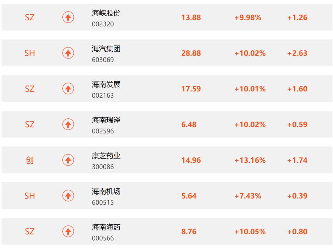 12月23日早盘,海南板块大幅高开,海峡股份、海汽集团、海南发展、海南瑞泽涨停,康芝药业、海南机场、海南海药、神农种业、海马汽车跟涨。