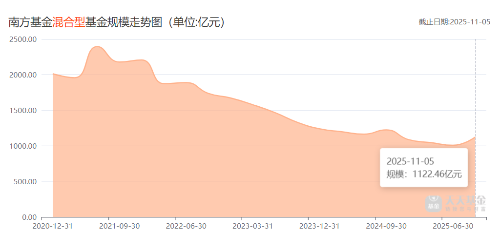 混合型基金也不乐观。截至2025年11月5日,南方基金混合型基金规模为1122.46亿元,较2021上半年的2394.21亿元,同样面临“腰斩”尴尬。