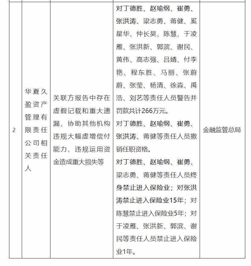 在机构层面,华夏久盈资产因“未按照规定运用保险公司资金等”违规情形,违反保险资金运用相关监管规定,被监管部门处以70万元罚款;