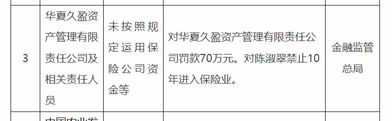 【导语】2025年12月19日,国家金融监督管理总局披露行政处罚决定,华夏久盈资产管理有限责任公司(下称“华夏久盈资产”)因未按规定运用保险公司资金等违规行为,被处以70万元罚款;时任公司总经理助理陈淑翠因相关违规行为,被采取10年禁止进入保险业的监管措施。