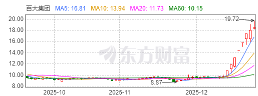 这一次,百大集团(600865.SH)成了资本的“香饽饽”。12月11日-12月18日,公司股价走出“6连板”行情,累计涨幅超70%。12月19日,百大集团人气值冲上同花顺热榜第6名,最新收盘价创下2017年以来新高。