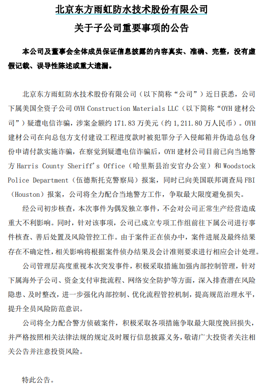 12月23日晚,东方雨虹公告,公司近日获悉,公司下属美国全资子公司OYH建材公司疑遭电信诈骗,涉案金额约171.83万美元(约1211.8万人民币)。