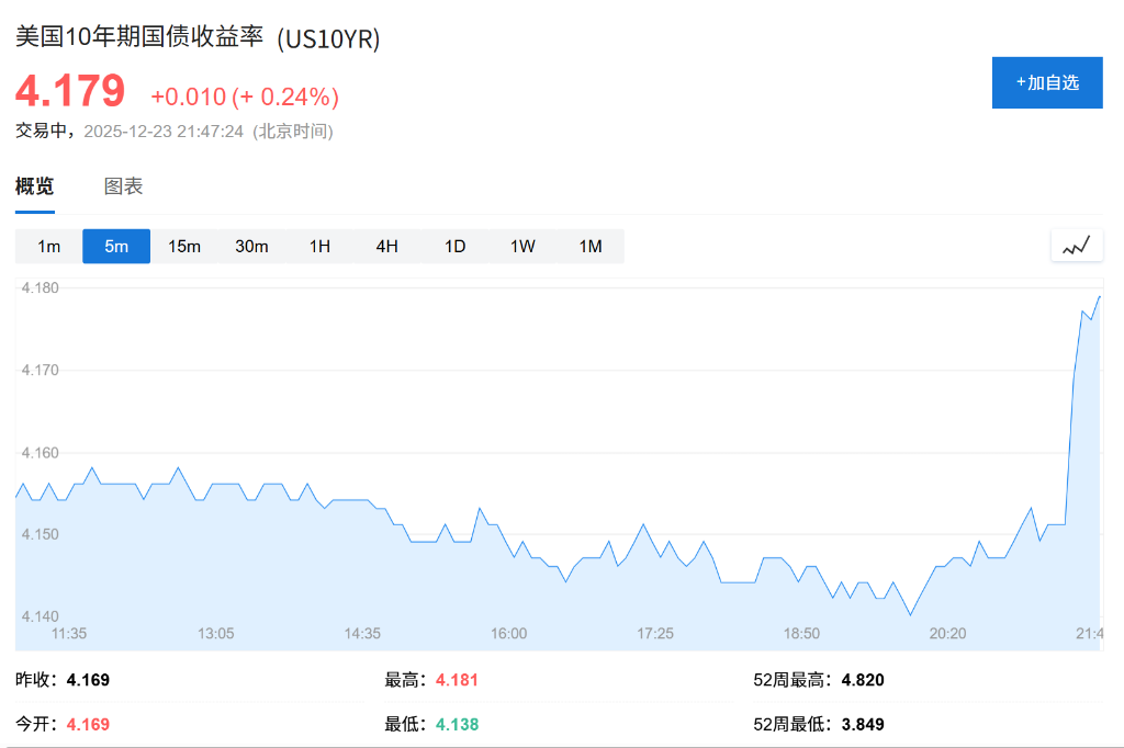 数据发布后,美元指数短线拉升约10点,现报97.99。美股期货短线波动不大,纳斯达克100指数期货维持约0.15%左右的跌幅。美国10年期国债收益率短线拉升,现报4.149%。现货黄金短线走低约4美元,现报4485.51美元/盎司。