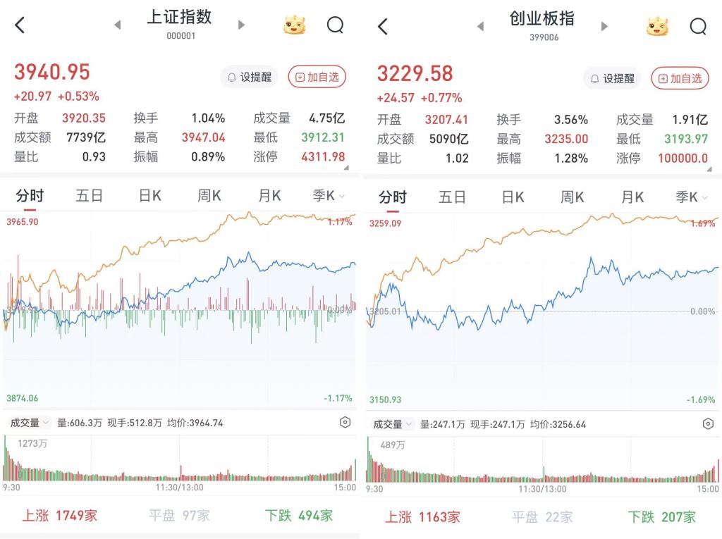 至收盘,上证综指涨0.53%,报3940.95点;科创50指数涨0.9%,报1352.13点;深证成指涨0.88%,报13486.42点;创业板指涨0.77%,报3229.58点。