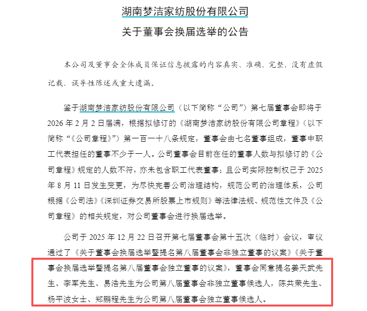 据公司昨晚公告,当前梦洁股份董事会在任董事人数与拟修订《公司章程》规定人数不符,且未包含职工代表董事。同时,公司实际控制权已于2025年8月11日发生变更。因当前董事人数与拟修订后章程要求不匹配,为完善公司治理结构、规范治理体系,依据相关法律法规,公司启动董事会换届选举工作。