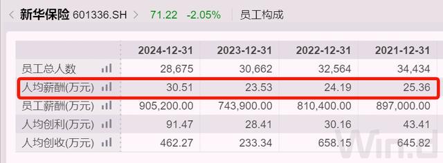 至2024年末,新华保险职工总数近2.9万人,去年人均创利91.5万元,人均税前薪酬30.5万元,比2023年大幅增加7万元。