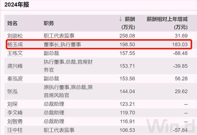 根据年报,2024年,杨玉成的税前薪酬大约199万元,位列第二;第一是职工代表监事刘崇松,259万元。