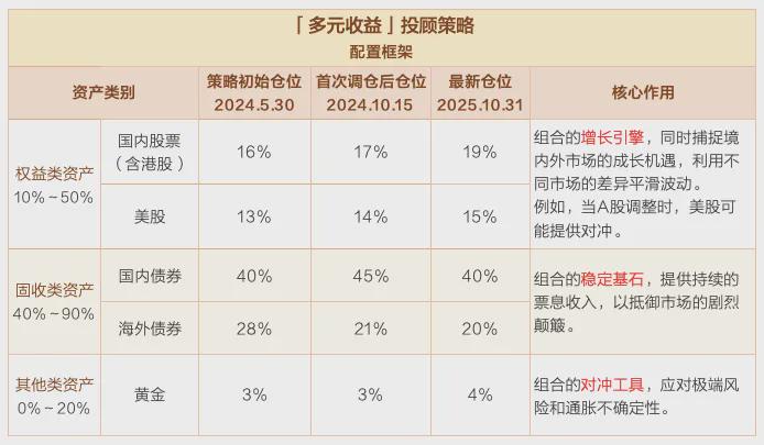 (1)清晰易懂的配置框架:通过对A股、港股、美股、国内债、海外债、黄金等多元资产的科学配比,让组合能适应不同的经济环境,追求长期的稳健增值。例如,当A股调整时,美股或黄金可能提供对冲。