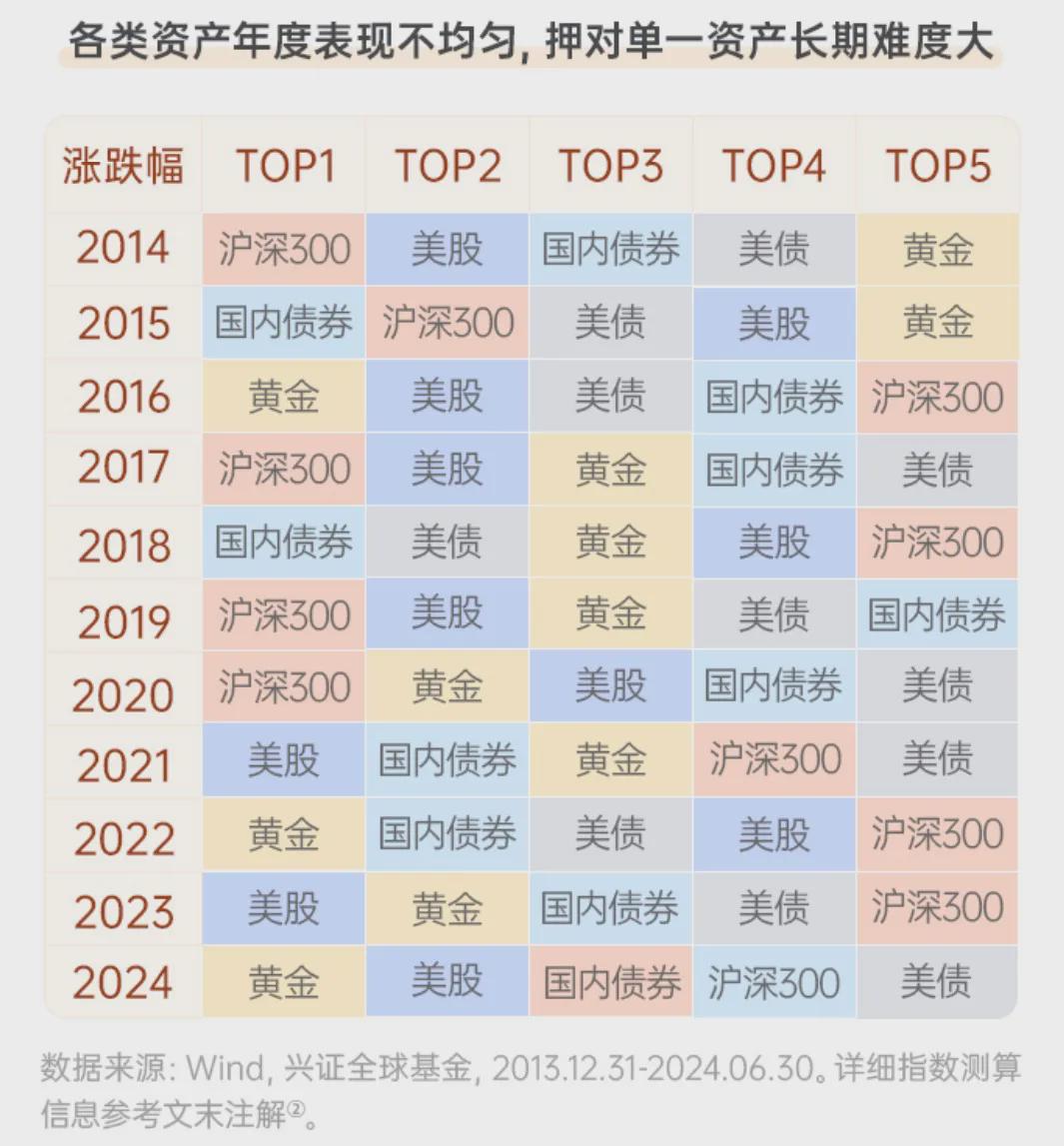 增长、稳健、避险——股、债、金各有各的优势,也各有各的颠簸,其实回看过去十年(2014-2024)主要资产的年度表现排名,我们会发现一个事实:根本没有常胜将军。